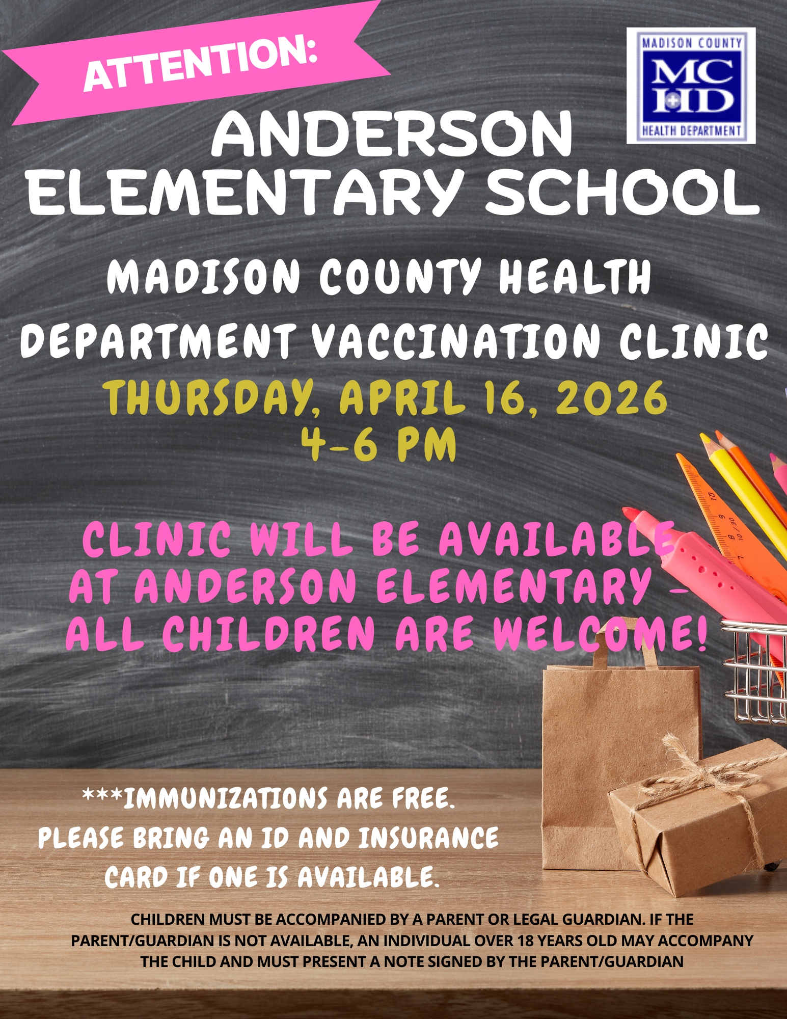 *The Madison County Health Department will be hosting a vaccination clinic at Anderson Elementary School. Both incoming Kindergarten students enrolling that evening, and all students, can receive their required vaccinations for free. It is required for a parent / guardian to accompany the student and bring an ID an insurance card (if available).